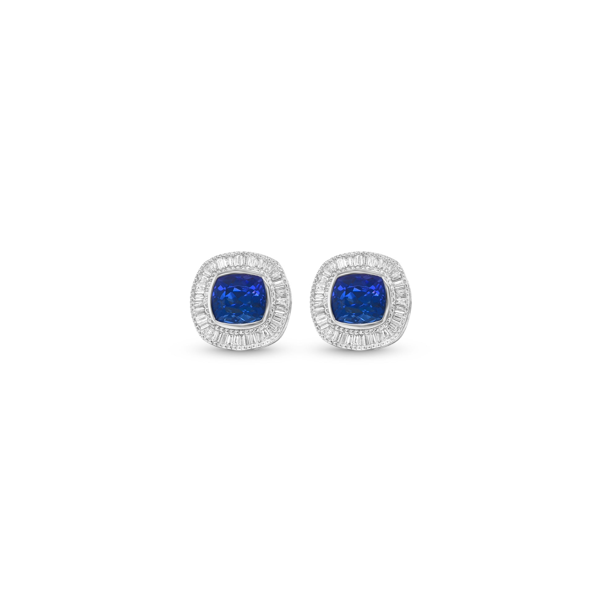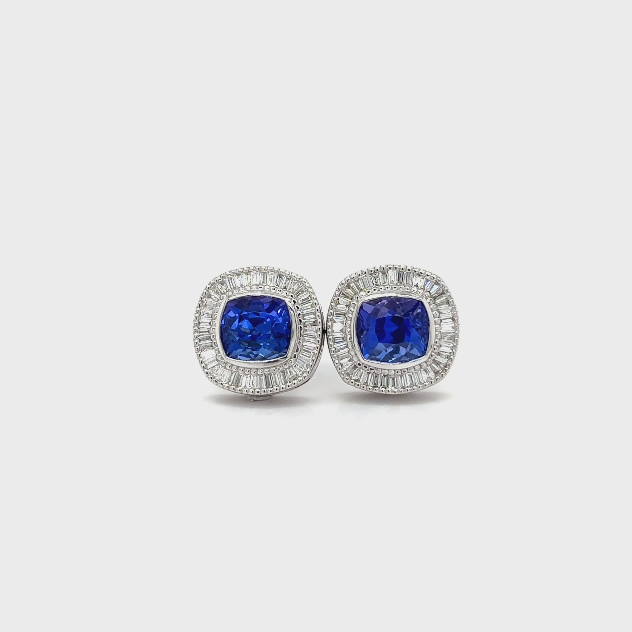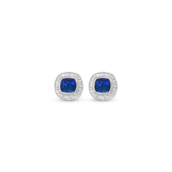 Cushion Tanzanite & Baguette Diamond Halo Stud Earrings