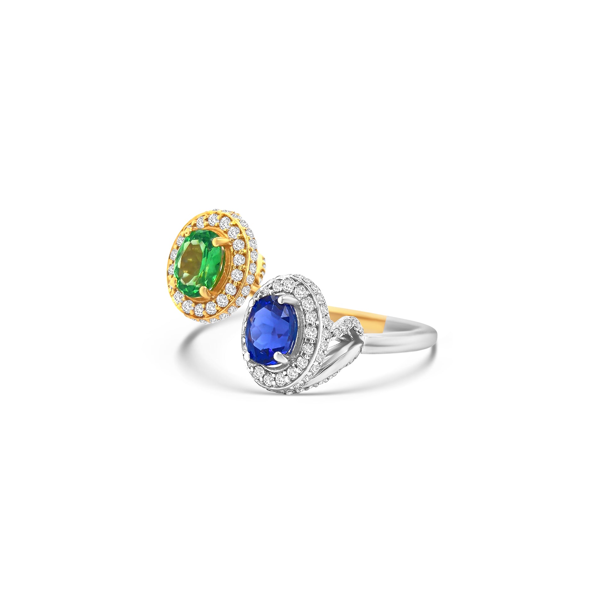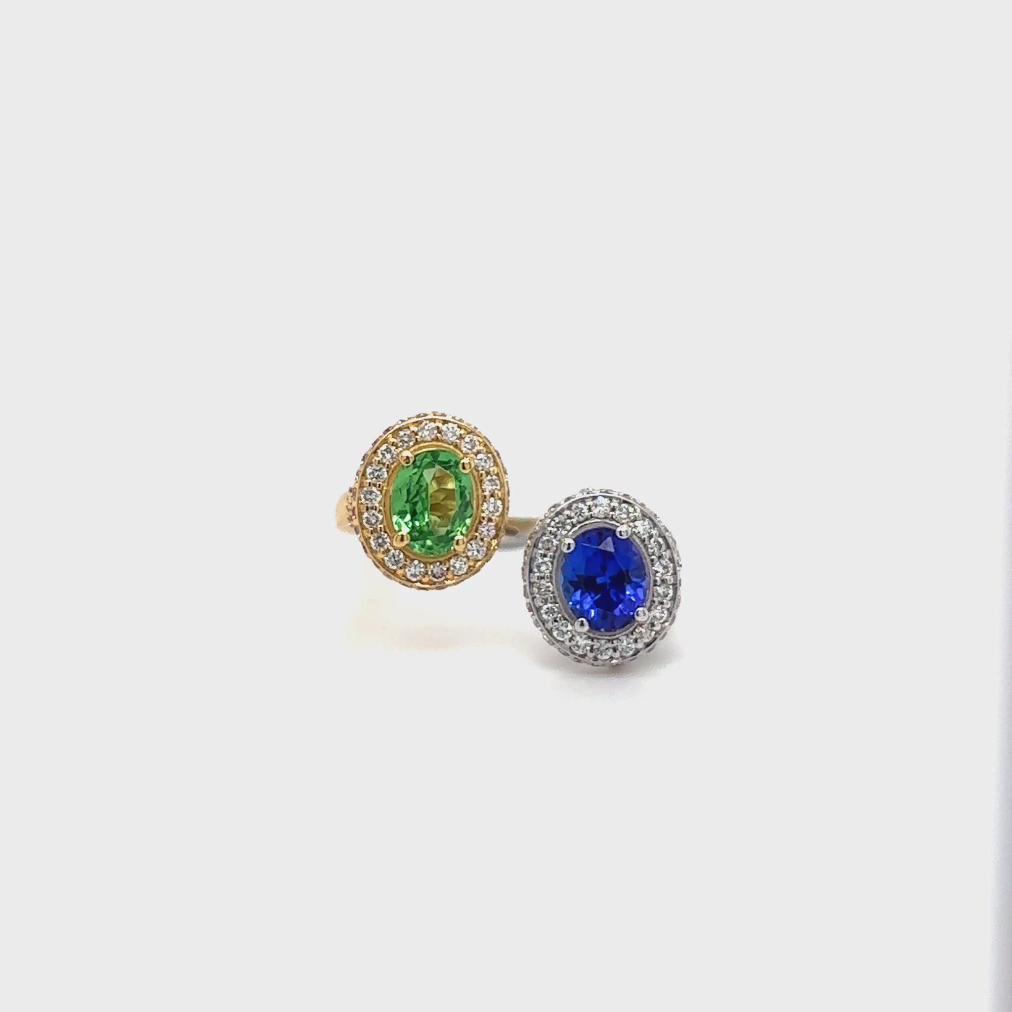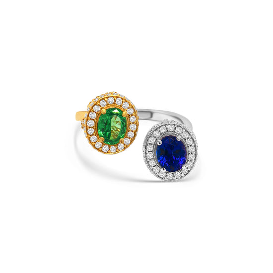 Two-toned Oval Tanzanite, Tsavorite & Diamond Halo Ring